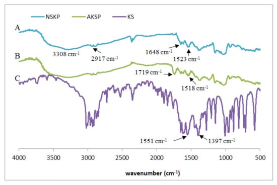 FTIR spectra were obtained between 500 and 4000 cm−1 (2 cm−1 resolution) to identify the signals with minimum transmittance for KS, NKSP, and AKSP. Diffuse Reflectance Infrared Fourier Transform Spectroscopy (DRIFTS) analysis was performed on the studied samples using a spectrometer Spectrum V5.3.1 (Perkin Elmer, Inc., Waltham, MA, USA).