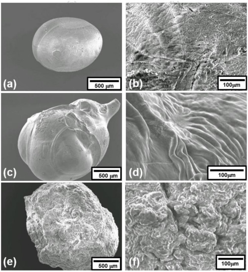 The surface morphologies of the biopolymer materials were recorded when they were in the xerogel form. For the various types of calcium alginate beads, the morphologies of the beads containing added Ag+ ions were quite similar to the precursor beads without Ag+. No significant change in the size of the alginate beads was observed upon impregnation with Ag+ ions; for example, CaALG and CaALG/Ag+ beads both had median diameters in the range 600–710 µm (determined using sieving experiments). Illustrated in Figure 3 are the SEM micrographs of the three types of Ag+-containing alginate beads in their xerogel form, prepared by immersion in 0.1 M AgNO3 solution. CaALG/Ag+(0.1) beads were almost spherical and had a very smooth morphology (Figure 3a,b). In contrast, CaALG/PGA/HSA/Ag+(0.1) composite beads (Figure 3c,d) were substantially less symmetrical, possibly due to the increased viscosity of the polymer solution used for the gelling process, and their surface exhibited large folds. CaALG/QA/Ag+(0.1) beads, which contain the quaternary ammonium function, had a very granular morphology (Figure 3e,f).