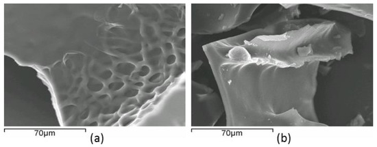 SEM images were also obtained for Ag+-free and Ag+-containing BSA/GLA xerogels (Figure 4). The surface of the metal-free BSA/GLA composite (Figure 4a) appeared smooth, although it was quite heterogeneous and contained deep craters of diameter ca. 50 μm. The latter indentations in the desiccated sample were probably the remnants of large water-filled macropores that permeated the former hydrogel [36]. The BSA/GLA/Ag+(0.01) sample (Figure 4b) also had a very smooth surface but lacked crater indentations, possibly reflecting a reduction in porosity and a tighter matrix arising from cross-linking by the resident Ag+ ion. In contrast, BSA/GLA/Ag+(0.1), which was prepared using a further 10-fold higher concentration of AgNO3, and which did not form a true hydrogel, had a more rugged appearance, and crystals of AgNO3 were clearly recognisable on the surface of the product (image not shown).