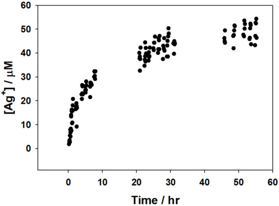 Concentration of Ag+ ions released into aqueous 0.2 M NaNO3 supporting electrolyte obtained using electrochemical determination from a BSA/GLA/Ag+(0.01) hydrogel disk over a 55 h period. The stripping peak currents were normalised with respect to deposition times and Ag+ concentrations determined using the averaged normalised calibration curve parameters.