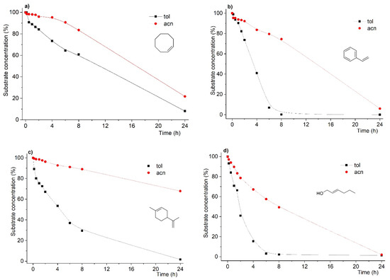Still, another feature arises from the data in Figure 1. Not only were the reaction rates affected by the solvent change, but the final conversion after 24 h was also found to follow the same dependence. As such, for most of the substrates, when acetonitrile was used as solvent, with the exception of the trans-hex-2-en-1-ol substrate, we found that the final conversions were lower, in some cases drastically, as in the case of R-(+)-limonene.
