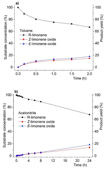 Concerning product yield (and inherently their selectivity) in the oxidation of R-(+)-limonene, we also found that virtually no changes were observed at isoconversion (i.e., conversion at similar values but obtained at different reaction times) when the solvent changed. This is most evident in Figure 2, showing the reaction profile (substrate conversion and product yield) for R-(+)-limonene oxidation. As can be seen, at the same conversion level (ca. 34%), the product yield distribution is identical for both solvents. The striking difference, as previously mentioned, is that the 34% conversion was obtained after 24 h in acetonitrile but after only 2 h in toluene.