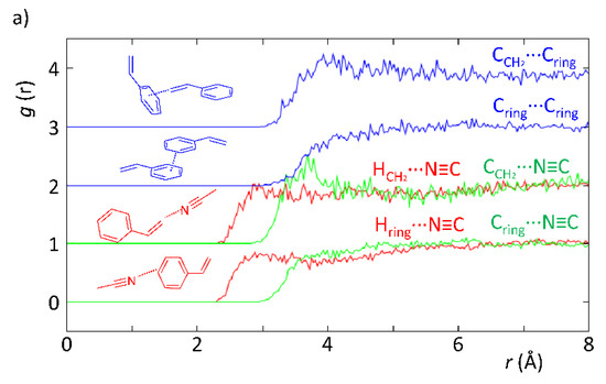 Partial radial distribution functions from EPSR simulation of experimental data obtained with SANDALS data from experiment RB1600022 on the styrene–acetonitrile (a) and styrene–toluene (b) systems replicating the ratios used in a catalytic experiment.