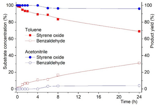 On the other hand, when the catalyst was MCMAW, strikingly different results were obtained. As shown in Figure 4, styrene oxide conversion into benzaldehyde was observed to reach 31% after 24 h reaction when using toluene as solvent. Changing the solvent to acetonitrile implied a drastic change, as only 7% of styrene oxide conversion to benzaldehyde as compared to the same reaction in toluene.
