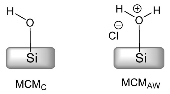The mechanism also provided insight into the active role of solvents. We used the set of two MCM-41-related materials, MCMC and MCMAW, differing in template extraction method (see Experimental Section for details). These MCM materials, as pictured in Scheme 3, had their surface with regular silanol groups (MCMC) and with Brønsted acid silanol groups (MCMAW) required for assistance in the postulated ring-opening process (Scheme 2) [23,39].