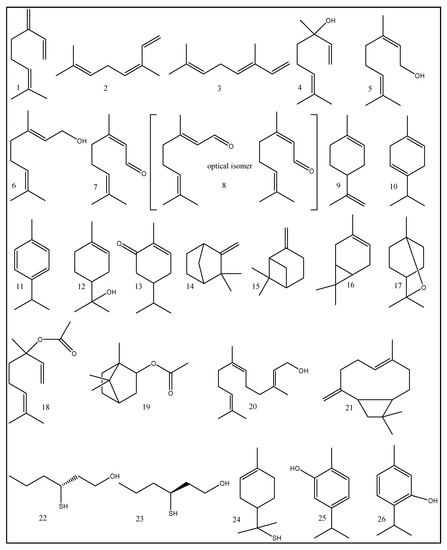 | 16 | ∆3-Carene | (sweet, fruity) [134] (woody turepentine) [133] | 0.77 [145] | 9.3 [152] | - | 4.5 [134] | 124 [133,134] |