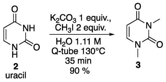 Scimmi, C.; Cardinali, M.; Abenante, L.; Amatista, M.; Nacca, F.G.; Lenardao, E.J.; Sancineto, L.; Santi, C. Q-Tube®-Assisted Alkylation and Arylation of Xanthines and Other N-H-Containing Heterocycles in Water. Chemistry 2021, 3, 1126-1137. https://doi.org/10.3390/chemistry3040082