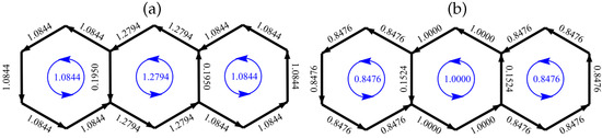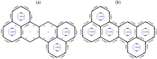 We can simplify the calculation of HL current for a benzenoid by noting that an electron in a non-bonding orbital of a bipartite system makes no contribution to the total current (see Section 3), so we may deal with the equivalent closed-shell system where any non-bonding occupancies have been set to zero. This closed shell corresponds to the neutral molecule for a Kekulean benzenoid, and otherwise to the cation of charge . This simplification is specific to bipartite systems treated within the HL model. In ipsocentric ab initio approaches [20,25,49], non-bonding orbitals may contribute current, whether or not the molecular graph is bipartite. Consideration of the nearest closed-shell for a non-Kekulean benzenoid has a direct chemical application in the study of benzenoid cations; a modified CC approach has been used to give an account of the current maps for these species [50].