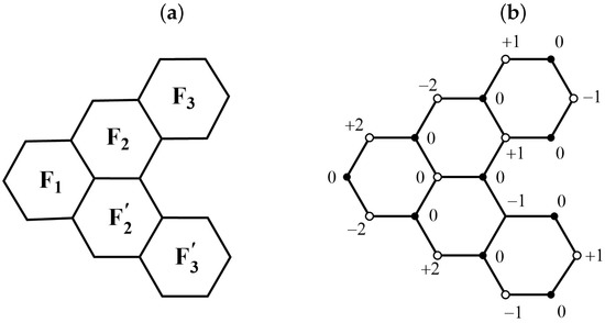 The graphs considered in this paper are benzenoids. Benzenoids may be defined as simply connected subgraphs of the hexagonal lattice composed of edge-fused hexagons. Hence, they correspond to connected planar graphs having all internal faces of size 6. The vertices on the interior have degree 3. The vertices on the perimeter (external face) either have degree 2 or degree 3. As is well known, the systems of benzenoids support circulations of electrons induced by an external magnetic field with consequences for magnetic susceptibilities and H NMR chemical shifts [13,14,15,16,17,21]. The calculation of this magnetic response in HL theory requires an embedding of the molecular graph, with explicit coordinates for the atomic positions. The embedding used here for benzenoids idealises each carbon framework as planar and composed of regular hexagons of side Å, embedded without overlap in the hexagonal tessellation of the plane.