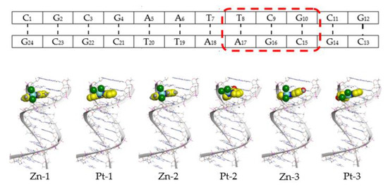 | Zn-1 | 6.67 × 106 | −3.45 | H-π (G16—biquinoline) H-π (A17—biquinoline) |