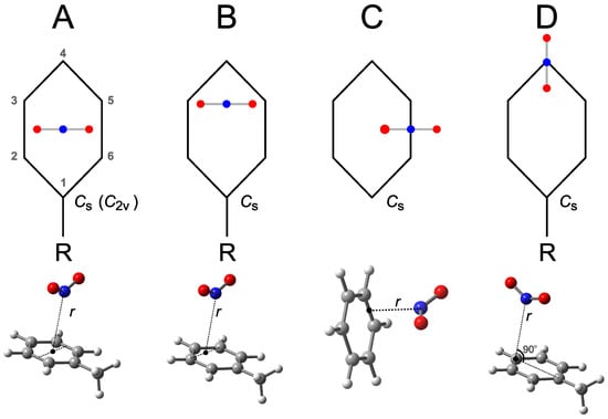 Illustrative pictures of the explored coordination paths. In path A, the projected direction of N–O bonds lies parallel to the line bisecting the bonds between ortho and meta C atoms of the aromatic ring, with N insisting perpendicularly over the geometric center of the ring; r denotes the distance between N and the center of the ring. Arrangement A assumes symmetry for toluene (benzene). In path B, the projected direction of N–O bonds lies parallel to the line connecting C3 and C5, with N insisting perpendicularly over the center of that line; r denotes the distance between N and the midpoint of the C3–C5 line. In path C, the projected direction of N–O bonds lies parallel to the line bisecting one of the C-C bonds of the aromatic ring; for () states of benzene, the compressed (elongated) C-C bond has been chosen, with N insisting perpendicularly over the center of that bond; r denotes the distance between N and the center of the C-C bond. In path D, the projected direction of N–O bonds lies parallel to the line connecting the C bearing the R substituent and the C in para position, with N insisting perpendicularly over the carbon in para; r denotes the distance between N and the C atom in para position.