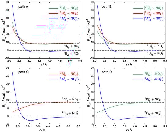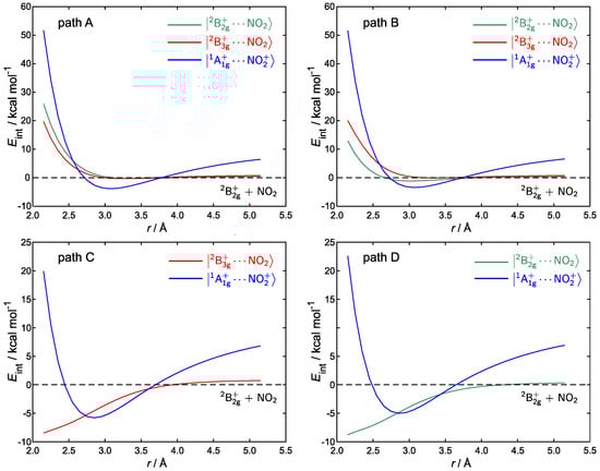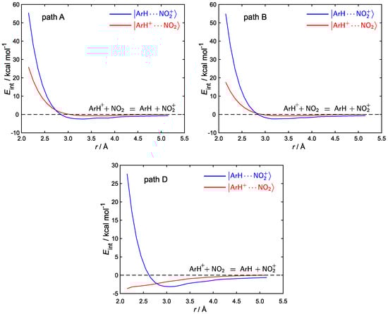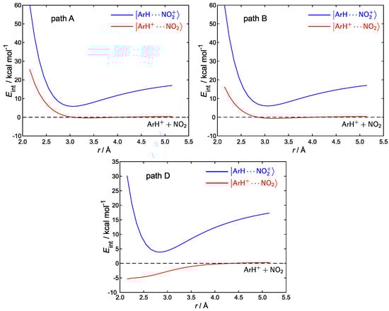 The profiles of paths C and D are particularly interesting, because those orientations are known to yield stable complexes with bent NO coordinated to benzene at Å (see Figure 2). Based on previous works by Olah and Parker [47,53], only the () state has been considered for path C (D), since it leads to a stable adduct with elongated (compressed) benzene. The potential energy profile for the rigid approach of reactants in the diabatic electronic state of path C exhibits a monotone increase from 2.15 up to 5.15 Å. Instead, the interaction energy of the state exhibits a minimum at 2.85 Å (see also Tables S3 and S4 in the Supplementary Materials). However, that minimum lies ca. 3 kcal/mol above the curve at 2.15 Å, which implies that the evolution of the complex toward the reaction products can proceed via an electron transfer step from benzene to NO. Identical considerations also hold for path D, upon reversing the roles of and .