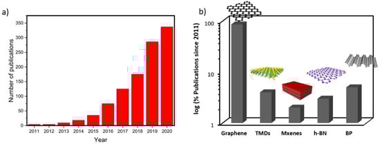 Interest in 2D materials has been growing, and after their in-depth fundamental study, they have been incorporated into multiple applications, something similar to what happened with carbon nanotubes. In many cases, it has not been a complete replacement, but rather a combination with an application already known to enhance its properties. The compatibility of 2D materials and 3D printing is one example. Figure 1a shows how the interest is growing, and this is reflected in the number of publications that are achieved year after year. The unique properties of 2D materials, coupled with their incorporation into printing matrices, create a new generation of composites with combined properties used in various fields, which we will discuss below.