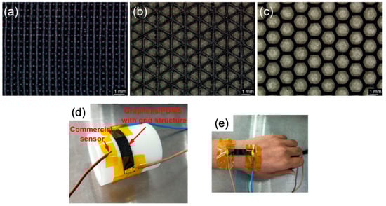 Optical images of the 3D-printed graphene/PDMS composites: (a) grid structure; (b) triangular porous structure; and (c) porous hexagonal structure. Monitoring the cooling process on a curved surface, (d) experimental setup, (e) simultaneous monitoring of wrist skin temperature. 2019, American Chemical Society©.