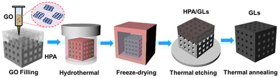 As for graphene, Kim and his group fabricated nanowires from reduced graphene oxide (rGO) without any supporting material using a nanometer-scale 3D printing approach that exploits a size-controllable liquid meniscus for freestanding writing []. The as-prepared rGO nanowires were used as 3D transducers in gas sensors for the detection of CO2. Overall, the electrical conductivity of rGO was dependent on the CO2 concentration. Thus, the electron transfer from the adsorbed CO2 to rGO leads to increased electrical resistance. However, the sensitivity of the gas sensor was still low, and changes in the resistance were reversible at room temperature. Similarly, hollow polymer architectures based on graphene were used to detect methane, ethylene glycol, and ethanol because of interactions between molecular and defective sites on rGO sheets []. In detail, the complex structure ink was made from GO/ethylenediamine via hydrothermal assembly, followed by freeze-drying strategies (Figure 5). The hollow polymer architectures were based on graphene printed by a mask image-projection-based stereolithography (MIPSL).