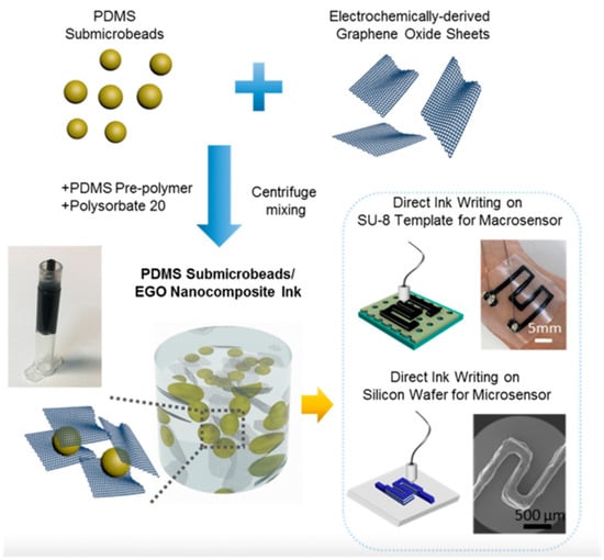 Schematic fabrication of PDMS sub-microbead/EGO nanocomposite ink and 3D direct ink writings wearable micro-sensor and micro-sensor. Adapted from ref. []. 2019, Elsevier©.
