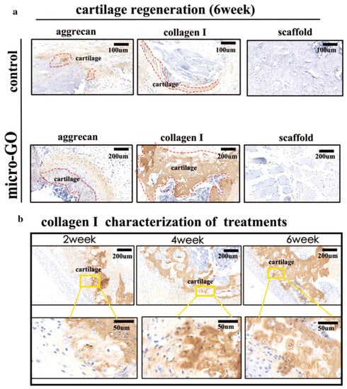 (a) Analysis of immunofluorescence staining with aggrecan and collagen I showing that the cartilage with 3D-printed scaffold only was thinner than that with micro-GO scaffold after six weeks (bar = 200 μm). (b) Significant differences of immunohistochemical collagen I in treatment with micro-GO scaffold from weeks 2 to 6 (bar = 200 μm, 100 μm, respectively). Adapted from ref. [].