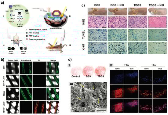 For instance, Pang and co-workers modified a 3D-BG scaffold soaking the devices in an aqueous solution of Ti3C2 (Figure 9) []. The designed device was tested in vitro and in vivo, and remarkably the dual functionality of bone-tumor killing and bone-tissue regeneration was demonstrated. The authors have demonstrated that the Ti3C2 accelerates the growth of newborn bone tissue of the composite BG scaffolds. Furthermore, it was observed that the scaffolds induced the death of bone cancer cells and eradicated the tumor on bone-tumor xenograft by NIR irradiation. Similarly, Ying et al. [] used Nb2C into 3D-BG for osteosarcoma treatment.