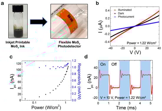 - Seo, J.-W.T.; Zhu, J.; Sangwan, V.K.; Secor, E.B.; Wallace, S.G.; Hersam, M.C. Fully Inkjet-Printed, Mechanically Flexible MoS2 Nanosheet Photodetectors. ACS Appl. Mater. Interfaces 2019, 11, 5675–5681. [Google Scholar] [CrossRef] [PubMed]