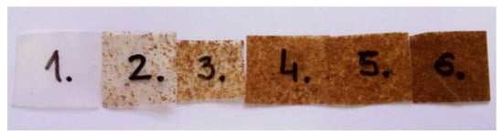 The RH were chopped to small size in IKA-WERKE M20 mixer and dried in an air-circulating oven at 105 °C for 24 h to remove moisture prior to mixing with LDPE. All LDPE/RH biocomposites under different RH content (10, 20, 30, 40 and 50 wt.%) were prepared by melt blending in the Brabender kneading chamber at 170 °C for 5 min (screw rotation speed was 60 rpm). The resulting LDPE/RH biocomposites were then hot-pressed into films by using a hydraulic press Fontune, Holland (SRB 140, EC 320 × 320NB) at temperature of 140 °C for 5 min, under the pressure of 25 kPa, for further tests. The films of biocomposites are displayed in Figure 1.