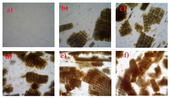 Optical micrographs of (a) neat LDPE, (b) LDPE + 10 wt % RH, (c) LDPE + 20 wt % RH, (d) LDPE + 30 wt % RH, (e) LDPE + 40 wt % RH and (f) LDPE + 50 wt % RH.