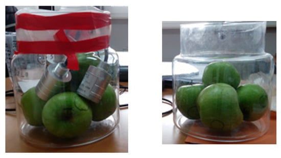 The fruit samples of apples (Malus x domestic Borkh, ‘Granny Smith’) were obtained from an orchard in Baštica near Kašić (Zadar County). Fruits were harvested in the optimal maturity stage for storage and transported to the laboratory of Department of Pomology, University of Zagreb within 24 h. For each film, 5 healthy fruits, uniform in weight (total sample mass about 900 g) and shape, were placed in 3500 mL glass jar together with the electrochemical CO2 sensor [20]. The jar was sealed with a film secured on the edge by an electrically insulating adhesive tape to achieve airtightness as shown in Figure 3. Respiration was measured for 6 days at room temperature conditions.