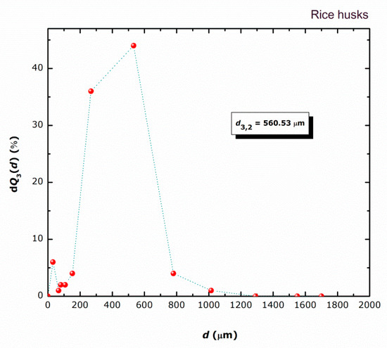 A profound study of the possibility of rice husk (RH) being able to act efficiently as a packaging material involves determination of its particle property distribution, viz. detection of the particle size distribution. Figure 4 reveals a relatively wide particle size distribution for the system studied. It is evident that rice particles are in the size range 0 up to 1700 μm with a great contribution of size intervals between 180 and 710 μm. Additionally, a calculated Sauter mean diameter (d3,2) of 560.53 μm discovers its dispersity state. Similar PSDs were found in previous studies on similar packaging material [26,27].