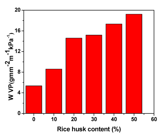 The results showed that the WVP of the LDPE/RH biocomposite films increased compared to the neat LDPE film. Moreover, the WVP of LDPE/RH biocomposite films systematically increased with increasing RH content. The obtained results suggest that the incorporation of RH led to a reduction in the WVP for RH-reinforced LDPE films. This is possibly due to the hydrophilic nature of the RH particles and because of the chances of agglomeration at higher filler loading.