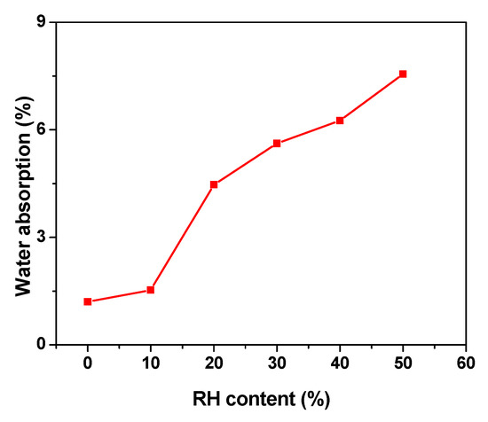 Generally, water absorption provides an illustration of the weight of water that can be absorbed on the materials. Figure 6 shows the water absorption for LDPE/RH biocomposite films as a function of RH content. The LDPE is a hydrophobic polymer, and this is reflected in the small amount of water absorbed. When the filler reinforced polymers are exposed to moisture, the hydrophilic rice husks swell, which leads to the micro cracking of composites. As the composites crack, the capillarity becomes active and, hence, the water molecules are actively attracted to the interface. As can be seen from Figure 6, the percentage of water absorption of LDPE/RH biocomposite films increases with an increase in RH content. The main reason could be the increasing hydrophilicity of the biocomposites due to the forming hydrogen bonding between water and the hydroxyl group from RH particles. Therefore, the time required to reach the saturation point of water absorption was longer for composites with higher RH content.