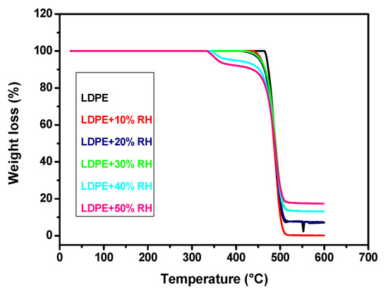 The initial weight loss of the neat LDPE occurred in a single stage of degradation from 458 to 504 °C. According to Kim et al., the thermal degradation of LDPE can take place through random chain scission and a radical chain mechanism [31]. The radical mechanism for polyethylene involves the formation of free radicals and abstraction of hydrogen from the polymer chains leading to a molecular weight decrease and, finally, to the formation of volatile products. Polyethylene decomposes into a large number of paraffinic and olefinic compounds without residue [32]. Figure 9 shows the TG of the neat LDPE and LDPE/RH biocomposites, while Table 4 depicts the thermal decomposition data of all samples, including initial degradation temperature (T0), end temperature (Tend) and the percentage residue at 600 °C.