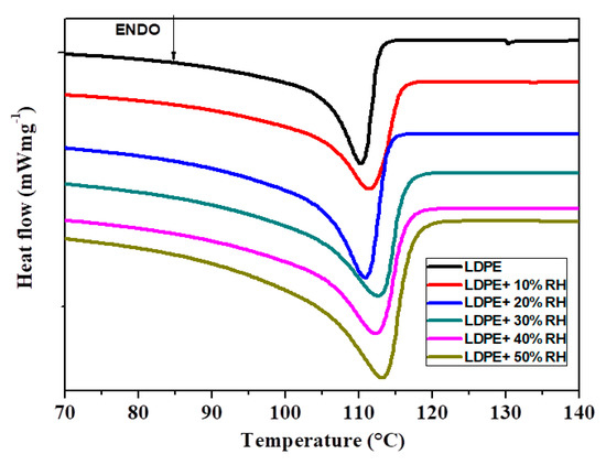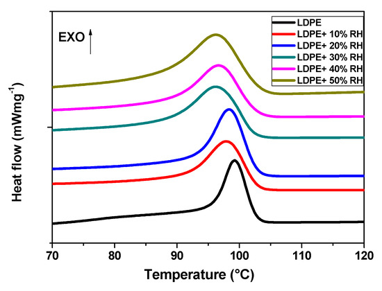 The DSC curves of the neat LDPE and LDPE/RH biopolymers during the cooling cycle are shown in Figure 11. The determined Tc values are listed in Table 5. The crystallization temperature of the LDPE film had slightly shifted to a lower temperature compared to the neat LDPE (99.3 °C) with the incorporation of RH. This behaviour might be due to the later initiation of crystallization with the incorporation of RH.