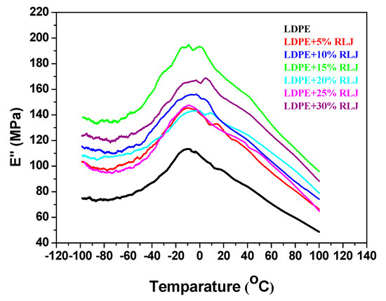 Dynamic mechanical analysis was used to determine the viscoelastic properties, including loss modulus, E’’, and storage modulus, E’. Additionally, this measurement gives useful indications of the state of particle dispersion and interactions between polymer-filler particles. Generally, in biocomposites in which fibers are used as filler, the dynamic mechanical properties depend on the nature of the polymer and the interactions between the filler and the polymer matrix, as well as the nature of the dispersion and orientation of the filler. In order to evaluate the effect of the RH particles in the LDPE matrix, viscoelastic properties were measured. The loss modulus (E’’) curves as a function of temperature for the neat LDPE and LDPE/RH biocomposite are shown in Figure 12. According to Figure 12, all loss modulus curves exhibit one relaxation maximum, which is related to the glass transition temperature (Tg) of the LDPE amorphous phase. The intensity of the area under these peaks decreases in relation to RH content. This behaviour might be due to the decreasing LDPE concentration in the biocomposites. The glass transition temperatures, Tg, obtained from E” are shown in Table 6. The Tg of the LDPE/RH films was shifted to a higher temperature with the addition of RH. This increase in the Tg may be due to a decreased degree of chain mobility of the amorphous phase of LDPE as well as an interaction existing between the RH and LDPE. Moreover, as RH weight content increased, the mobility of the polymer chains decreased, and Tg increased.