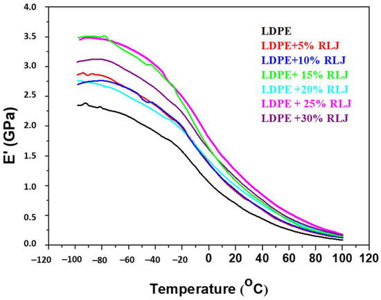 The small relaxation peak as a shoulder obtained around 50 °C corresponds to the αh transition related to the LDPE crystalline fractions [34]. Figure 13 shows the temperature dependence of the storage modulus (E’) of the pure LDPE and LDPE/RH biocomposites.