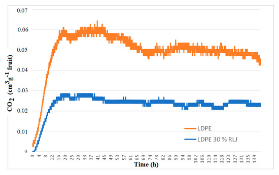Figure 14 shows respiration dynamics (cm3 CO2 g−1 fruit) of ‘Granny Smith’ apples during 6 days at room temperature, as affected by LDPE and LDPE 30% RH films. From the curve, it is evident that the respiration of the fruits under the RH-added film was significantly lower than that of the fruits under the neat LDPE film. This has not reflected on weight loss that was similar for both types of films but significantly differed from the control sample (Table 8).