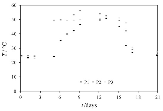 Temperature changes in composting mass in experiments P1, P2 and P3 for 21 days.