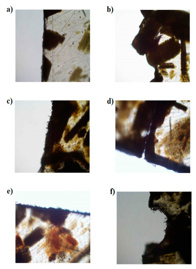 Biodegradation of biopolymers during 21 days of composting process: LDPE + 10% RH (a) at the beginning of composting and (b) after composting process; LDPE + 40% RH (c) at the beginning of composting and (d) after composting process; LDPE + 50% RH (e) at the beginning of composting and (f) after composting process.