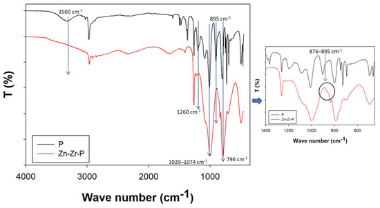FTIR analysis was conducted in order to understand the chemical structure of the newly synthesized nanocomposite coating (Zn-Zr-P). Figure 1 shows the differences in PDMS (P) chemical structure after in situ reaction with doped NPs. In the spectrum of the polymer, it is possible to note that the presence of the broadband located in the spectral region 3000–3700 cm−1 corresponds to the –OH stretching from the absorbed water and ethanol [39,40], while in the other spectrum, it is clear that the disappearance of the –OH band around 3500 cm−1 may be due to leaving of –OH groups and linking of the NPs with –Si groups. In addition, the C–H absorptions at 2931 and 2892 cm−1 can be seen in both spectrums due to the presence of –CH3 groups [15,17,40]. Moreover, the changes of the –Si–CH3 band at around 1260–1259 and 789–796 cm−1 and the disappearance of the Si–OH absorption peak at 895 cm−1 which also provide a good confirmation of the cross-linking behavior (creates covalent bonding) in between NPs and the –Si groups [40,41]. It is worth noting that the most important band of the Si–O–Si stretching band (1020–1074 cm−1) changed due to the reaction [40], and the new shoulder peak appeared between 876 and 895 cm−1, which may be due to the formation of Si–O–Zn bonds (see Figure 1 enlarged spectrum) [42,43]. All these behaviors indicate that PDMS correctly linked with the doped NPs in the in situ reaction as expected and it is very important to produce good nanocomposite coating properties, because, if there is a chemical bond in between NPs and the polymer materials, they can produce a more durable coating than just coating with NPs as additives.