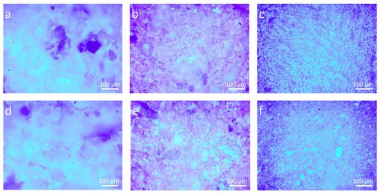 Optical microscope images (by UV light) of stones treated with two different coatings: (a) P_LS, (b) P_B, (c) P_M, (d) Zn-Zr-P_LS, (e) Zn-Zr-P_B, and (f) Zn-Zr-P_M.