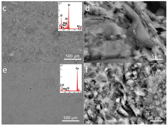 SEM-EDS analysis of PDMS treated stones in two different magnifications (500 µm and 5 µm): (a,b) P_LS, (c,d) P_B, and (e,f) P_M. The EDS spectra are the inset of the lower magnification images (500 µm).