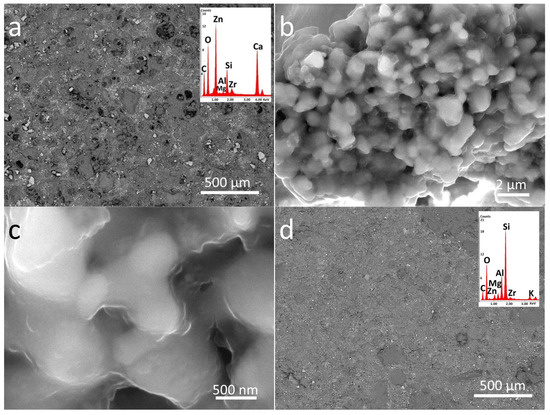 EDS analyses were also performed in order to investigate the elemental composition of materials applied on the stone surface. The results clearly confirm that coatings labelled as P mainly contain C, O, and Si, while the nanocomposite also include Zn, and Zr, as components due to the presence of doped NPs (see inserts in Figure 3 and Figure 4).