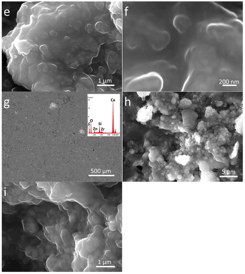 SEM-EDS analysis of nanocomposite treated stones in different magnifications: (a–c) Zn-Zr-P_LS, (d–f) Zn-Zr-P_B, and (g–i) Zn-Zr-P_M. The EDS spectra are the inset of the lowest magnification images (500 µm).