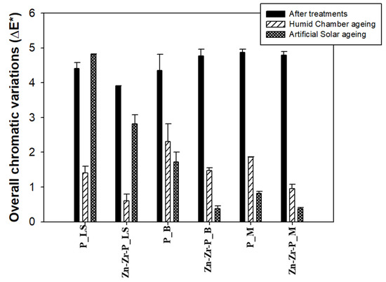 As indicated before, both coatings did not significantly alter the original color of stone specimens (∆E* < 5). The data corresponding to chromatic variations are reported in Table 1, and graphically summarized in Figure 5. In general, both ageing methods did not affect very much the color of treated stones as the overall chromatic variations were below five in all the cases. Solar ageing affects to a larger extent coating on LS (∆E*P_LS~4.8, and ∆E*Zn-Zr-P_LS~2.8) than humid chamber ageing (∆E*P_LS~1.4, and ∆E*Zn-Zr-P_LS~0.6). On the contrary, the larger changes observed on treated brick and marble were due to the humid chamber ageing. This result could be tentatively explained on the basis of the lower porosity of B and M, which make the coating layer homogeneously distribute (NPs and polymer) on the stone surface which allow the attainment of the highly superficial layer of nano-coating on those stones due to their lower porosity with respect to the LS, which may be involved in the protection of the coating by solar ageing. In addition, the L* coordinate became lower after humid chamber ageing in most of the cases, indicating that treated stones became little bit darker due to the humidity and temperature, while both the L* and b* coordinates changed due to solar ageing (Table 1).