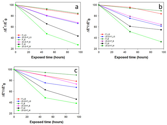 Moreover, the photocatalytic activity of the treated stones can be evaluated using another method, in which the rates of overall chromatic variation were used to examine the discoloration effect. In particular, the ratios ΔE*/ΔE*0 at different irradiation time intervals were calculated, where ΔE*0 expresses the total color difference between treated MB stained and treated unstained surface at a time equal to zero minutes. ΔE* corresponds to the same measurements recorded at each irradiation time and all the calculations were conducted using the following Equations (2) and (3) [15].