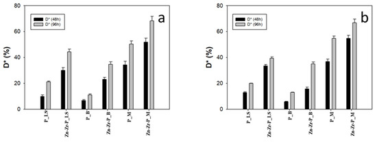 The photodegradation effect of both coatings was examined by handling MB dye discoloration test under UV light irradiation as explained in the experimental section. First of all, the dye degradation ability of a nanocomposite coating before the ageing was investigated with respect to the plain polymer coating as shown in Figure 6a and Table 3. The effect of the self-cleaning behavior was evaluated by considering the ratios of overall chromatic variation obtained at different time intervals as well as by calculating the D* (%) values after 48 and 96 h irradiation time. Results showed that all the stones treated with a nanocomposite coating enhanced the photodegradation effectiveness when compared to the plain PDMS-treated stones. For instance, the increment in D* was about 20% in the case of Lecce stone and bricks treated by Zn-Zr-P, while it was 40% in the case of marble stone coated with the nanocomposite. The mechanism of MB dye degradation by NPs under UV light irradiation was clearly explained in previous papers [13,14,49] as well as the photo-absorbing capacity (UV light absorbing ability) of ZnO NPs alongside ZrO2 NPs as good semi-conductive materials [23,24,50]. The highest discoloration effect for both treatments was observed on Marble (D* about 72, and 56% after 96 h for Zn-Zr-P, and P, respectively), likely because of the presence of a good superficial thin layer on the poorly porous stone surface, which could allow a more efficient degradation of MB dye under UV light irradiation. Notably, nanocomposite-treated stones displayed higher discoloration effects than corresponding substrates treated with plain PDMS, confirming that doped NPs considerably contribute to increase the photodegradation efficiency. The results obtained by the phtodegradation tests are in good agreement with previously reported data concerning only PDMS-treated stones [14,15,16,40].