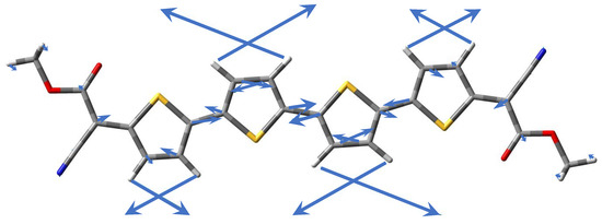 - Janzen, D.E.; Burand, M.W.; Ewbank, P.C.; Pappenfus, T.M.; Higuchi, H.; da Silva Filho, D.A.; Young, V.G.; Brédas, J.-L.; Mann, K.R. Preparation and Characterization of π-Stacking Quinodimethane Oligothiophenes. Predicting Semiconductor Behavior and Bandwidths from Crystal Structures and Molecular Orbital Calculations. J. Am. Chem. Soc. 2004, 126, 15295–15308. [Google Scholar] [CrossRef]