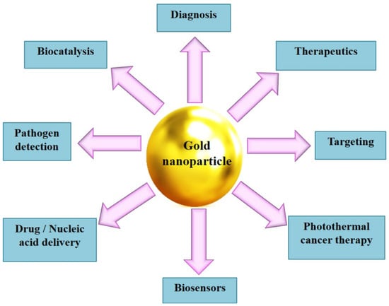 Nanotechnology is a promising field that integrates the various disciplines of science, engineering, and technology. The rapid scientific advances in this field have led to the development of different types of functional nanoparticles (NPs), with at least one dimension in the typical size range of 1 to 100 nm. Among the various metallic NPs, gold nanoparticles (AuNPs) have attracted huge attention due to their unique surface plasmon resonance properties, facile synthesis, tunable sizes, and multifunctional abilities with well-characterized properties [1,2]. They are versatile materials, relatively inert, biocompatible, and generally stable. Due to their well-defined surface chemistry, AuNPs can be easily conjugated with different molecules such as proteins, dyes, drugs, antibodies, enzymes, and nucleic acids [3,4,5]. AuNPs functionalized with different targeting moieties have enormous scope in various biomedical applications such as diagnosis, targeting, drug/nucleic acid delivery, imaging, and therapy (Figure 1). Furthermore, by employing the surface-enhanced Raman scattering technique, AuNPs are used as sensitive probes in Raman scattering and imaging applications [6]. The potential of AuNPs in biomedical fields has been tremendously increased by virtue of their applications in photothermal therapy, radiation therapy, computed tomography, biosensors, etc. [7]. Due to their intrinsic electrical and optical properties, as well as their ability to conjugate with different biomolecules, AuNPs-based biosensors with high sensitivity and selectivity are being developed [8,9]. In the last decade, AuNPs-based biosensors have attracted great attention in the diagnosis of various types of diseases. Recently, Antonio et al. [10] highlighted the various AuNPs-based biological assays for the detection and quantification of analytes in urinary samples, with a focus on protein analysis. Such assays using AuNPs are useful in the diagnosis of several illnesses such as kidney disorders, cancer, and heart diseases [4,11].