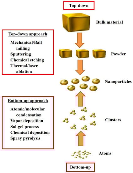 Top-down and bottom-up approaches for nanoparticles synthesis.