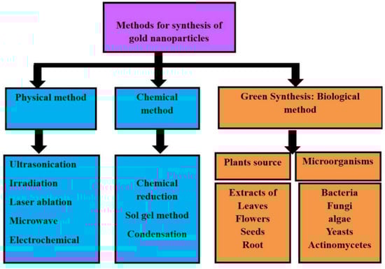 The different methods of AuNPs synthesis, such as physical (ultrasonication, irradiation, electrochemical, etc.), chemical (vapor deposition, sol–gel process, etc.), and biological methods (using plants and microbial sources), are shown in Figure 3. However, the various physical and chemical methods used for the synthesis of NPs are expensive and hazardous to human health due to the use of toxic components and the production of byproducts, either during the synthesis or during the capping/stabilization process of NPs. The use of chemicals raises serious environmental and toxicity concerns when administered to living organisms. For instance, the surfactant cetyltrimethylammonium bromide (CTAB), which acts as a stabilizer and template for the growth of gold nanorods in the seed-mediated method, is reported to be highly toxic to different types of cells [21]. Therefore, gold nanorods stabilized with CTAB are not suitable for biomedical applications and need to be properly surface-modified with biocompatible materials such as phospholipids or polyethylene glycol [22]. Hence, there is a growing requirement to search for reliable, non-expensive, biocompatible, and environmentally friendly methods for the synthesis of NPs.