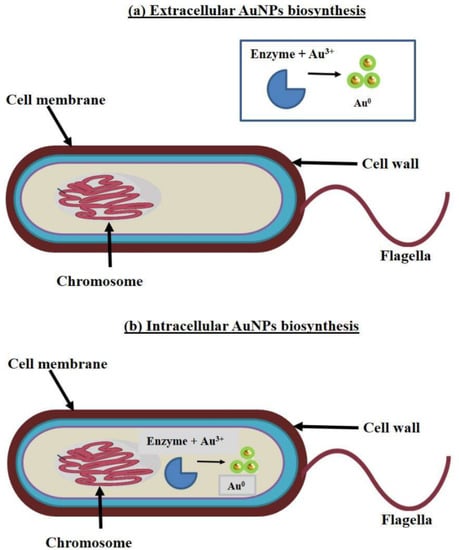 A variety of biocompounds (enzymes, phenols, sugars, etc.) can participate both in the reduction and stabilization of different types of particles, including AuNPs [25]. Figure 5a,b show the biosynthesis mechanism of bacterial microorganisms, which can act as a “factory” for the production of AuNPs. The biosynthesis mechanism of the microorganisms can be either extracellular or intracellular based on the location of AuNPs production [26]. Extracellular biosynthesis occurs outside the bacterial cell by trapping and reducing metal ions in the presence of enzymes. On the contrary, in the intracellular method, metal ions are transported into the microbial cell to form NPs in the presence of enzymes [27].