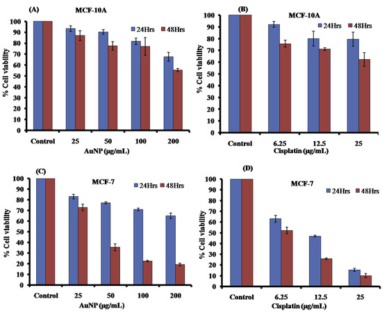 Cell viability using MTT assay after treatment with AuNPs and cisplatin on MCF 10A (A,B) and MCF 7 cell lines (C,D). Reprinted with permission from Ref. [109]. Copyright 2019 Elsevier.